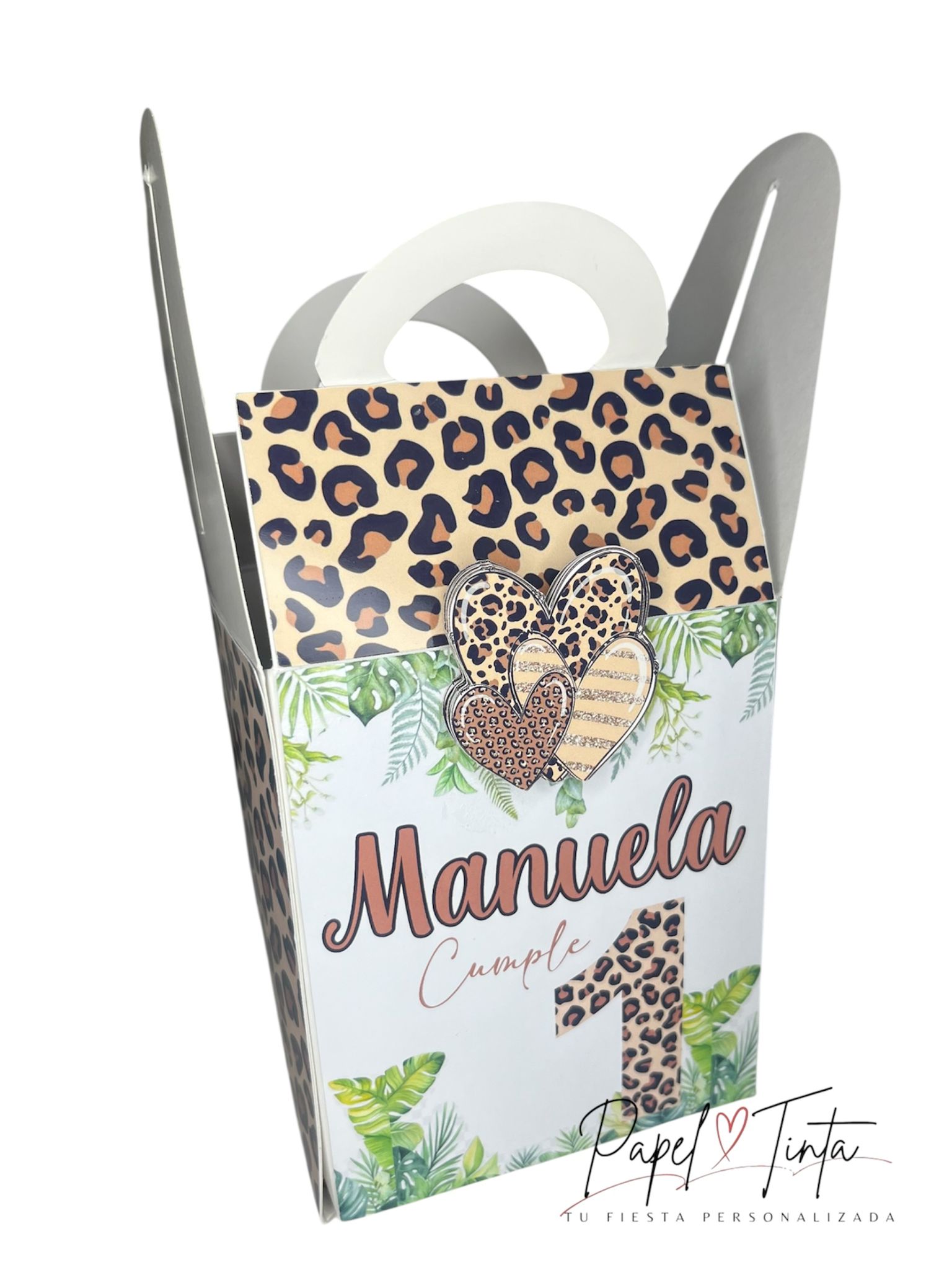 Fabricada en cartón de alta calidad, incluye aplicaciones en 3D que aportan un acabado original y llamativo. Es perfecta para presentar dulces, recuerdos o pequeños obsequios, convirtiéndose en un detalle funcional y estético para tus invitados.