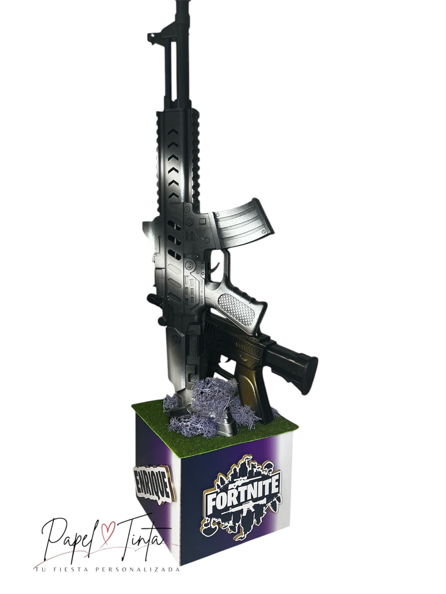 Sorprende a tus invitados con este increíble centro de mesa inspirado en Fortnite, ideal para cumpleaños temáticos o eventos gamer. Diseñado en una base de cartón resistente con acabado tipo pasto sintético, decorado con rifles de juguete de gran realismo y detalles llamativos como el nombre personalizado y el logo de Fortnite.